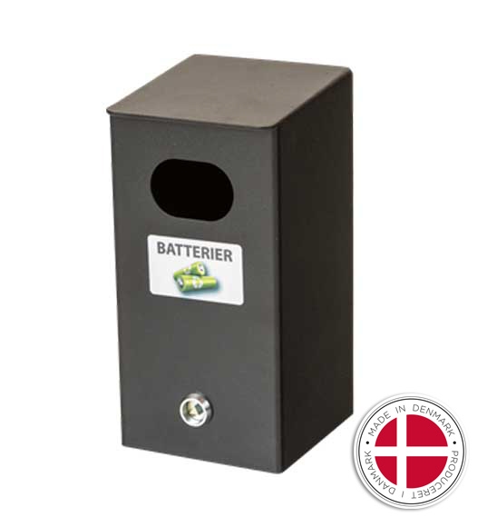Batteriboks til kildesortering i pulverlakeret stål. Med denne boks til brugte batterier er det nemt at samle disse til korrekt sortering på genbrugsstationen. Batteriboksen monteres på væggen og er let at tømme. Hold en pose under boksen, åben bunden og lad batterierne falde ned i posen. Trekantnøgle medfølger til tømning. Batteri beholderen er til indendørs brug.