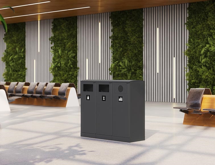 Bica affaldsbeholder i stål (2mm) med enkelt åbent indkast, så adgang fra ene side. En elegant affaldsløsning i stilrent og praktisk design, velegnet til indendørs affaldssortering i forskellige professionelle miljøer og offentlig tilgængelige steder. God til bl.a. indkøbscentre, biografer, togstationer, messecentre og lignende steder, hvor der færdes mange mennesker. Beholderen er en del af den fleksible Bica Advanced serie, der består af en række forskellige affaldsmoduler, som kan kobles sammen med beholdere i samme størrelse (her 90 liter, lys antracit). Disse 90 liter beholderen sættes sammen ved hjælp af skruer gennem de fire klargjorte huller på siden (se billeder for inspiration). De har integreret drypbakke og poseholder med vippefunktion, for nem og ergonomisk korrekt tømning via frontdør. Beholderen har justerbare fødder skjult bag soklen samt skjulte hængsler. Piktogrammer tilkøbes.