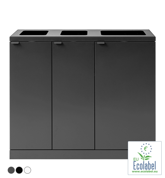 Affaldsstation m. 3 fraktioner til indendørs affaldssortering. 2 rum á 65 l. samt et rum á 95 l., alle åbne indkast huller. Det store rum er fx. velegnet til restaffald som ofte kræver mere plads. Affaldsbeholderen er i pulverlakeret stål (1,3 mm), og er en elegant og fleksible løsning til håndtering af affald på diverse arbejdspladser mm. Den er fra den fleksible Bica Advanced serie af modulære affaldsbeholdere til det indendørs rum. Disse kan nemt sammensættes efter behov, med beholdere med 1, 2 eller 3 fraktioner (se billeder og video for inspiration). Beholderne har integreret poseholdere og tømmes nemt og hurtigt via frontdør med soft-close. Dermed undgår man tunge løft ovenud. Har også dæmper i top, for sikker og rolig lukning.