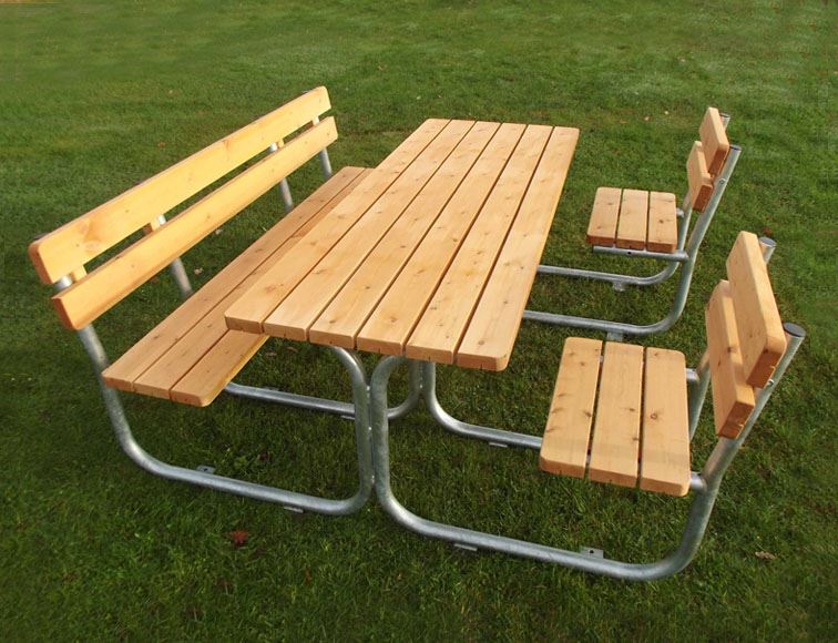 Kørestolsvenlig bord/bænkesystem med ryglæn velegnet til brug ved diverse grønne områder, special skoler, plejehjem, andre bosteder mv., hvor der færdes ældre og andre gangbesværede i kørestol. Bord/bænkesættet har nem adgang for 1 kørestolsbruger midt på den ene langside, derudover er der plads til 6 personer på bænkene rundt om bordet. Bord-bænken har rundt stel i varmgalvaniseret stål (Ø50 mm. 3 mm tykt), og oliebehandlede / brunlaserede planker i Svensk Nordlandsfyr (40 X 115 mm), PEFC certificeret. Den anvendte olie er Svanemærket. Bord-bænkesættet har 6 planker i bordpladen, 3 planker i sædet og 2 planker i ryggen. Sæde, ryg og bordplade leveres færdig samlede med afrundede hjørner. Bord/bænke systemet er forberedt til fast montering på jorden.
