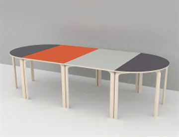 Institutionsbord med halvbue form og formstøbte ben, velegnet til brug i institutioner. Bordet er udført i 18 mm hvidpigmenteret birkekrydsfiner, med slidstærk laminat på overfladen. Hertil kan vælges imellem flere farver. En serie af institutionsborde med mange muligheder. Leg med former og farver ved køb af flere borde, og sæt f.eks. to halvbuede borde sammen med et firkantet bord og få et aflangt bord med runde ender. Bordet er miljøcertificeret med Ecolabel