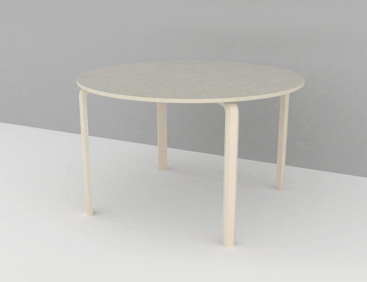 Rundt bord med formspændte ben og linoleum på overfladen. Velegnet til institutionsbrug. Bordet er udført i 18 mm hvidpigmenteret birkekrydsfiner. Vælg imellem bord med Marmoleum (marmoreret) eller Desktop(ensfarvet) linoleum overflade i rullegardin. BEMÆRK at Desktop linoleum er lidt dyrere. HUSK at angive ønskede farve ved bestilling.