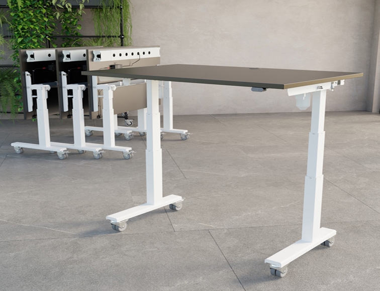 Lækkert hæve sænkebord med flip-top bordplade fra danske Conset. Bordpladen kan vippes 90 grader. Vippefunktionen gør det nemt at opmagasinere et stort antal borde, når de ikke er i brug. Designet understøtter adaptable og flytbare kontorlandskaber, hvilket gør det ideelt til hot desking med fleksible kontorer, samarbejdsområder, projektzoner og lignende. Bordet passer med sit enkle udtryk ind i ethvert kontormiljø / uddannelsesmiljø. Et godt og pladsbesparende klapbord med mange anvendelses muligheder. Bordet har letløbende hjul (låsbare), hvilket gør det mobilt og nemt at flytte efter behov. Enkel betjening af højde med to piletaster. Leveres med kabelhul i bordpladen (indbygget kabelgennemføring)Ønsker man at bruge bordet uden synlig ledning, kan man tilkøbe er genopladeligt batteri-kit. Se link nedenfor.