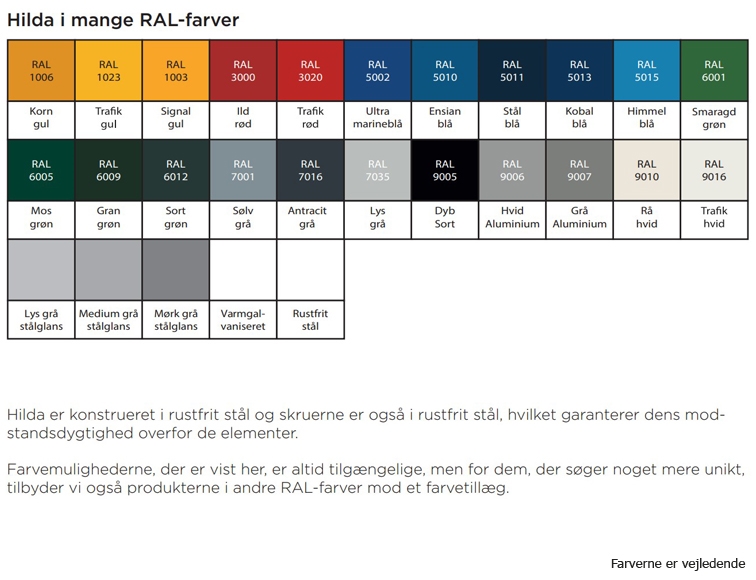 Farver/varianter: Fås i galvaniseret, rustfrit el pulverlakeret stål (RAL farver). Se farvekort og vælg ønskede nedenfor.