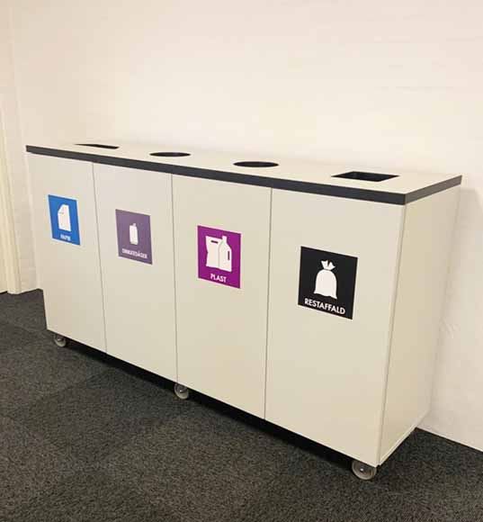 Kildesortering med 4 moduler til affaldssortering. Velegnet til sortering af affald på arbejdspladser, skoler og lignende steder med kantiner og diverse fællesrum. Hvert affaldsmodul kommer som standard med udtræk til affaldssæk (110 L). Dette kildesorteringsmøbel / affaldsbeholder har top plade i laminat på mdf (25mm), og korpus i decor på spån (18 mm). Toppladen afsluttes med ABS-kant. Leveres samlet.