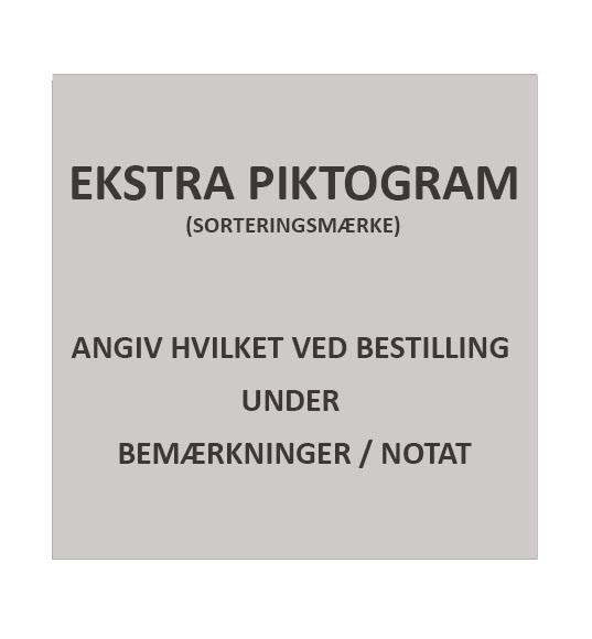 Der medfølger ét standard piktogram pr. fraktion. Se oversigt over piktogrammer (7x7 cm, sort m. gennemsigtig baggrund) fra Brancheforening Cirkulær som kan ses på nogle af billederne. HUSK ved bestilling at notere hvor og hvilke/t piktogram I ønskes på jeres beholdere.