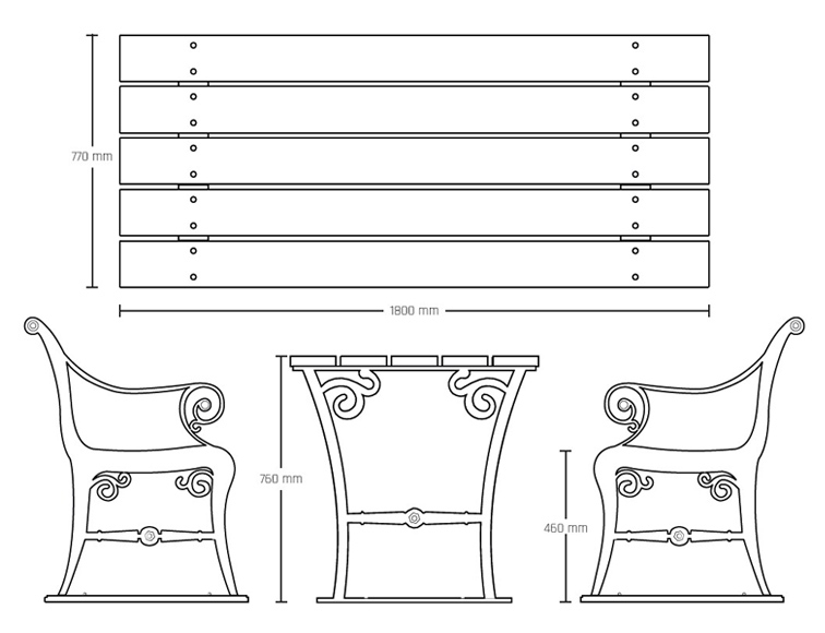 Mål: Bænk: L 190 cm. Bredde 58 cm. Siddehøjde 46 cm. Bord: L 180 cm. Bredde 77 cm. Bordhøjde 76 cm.
