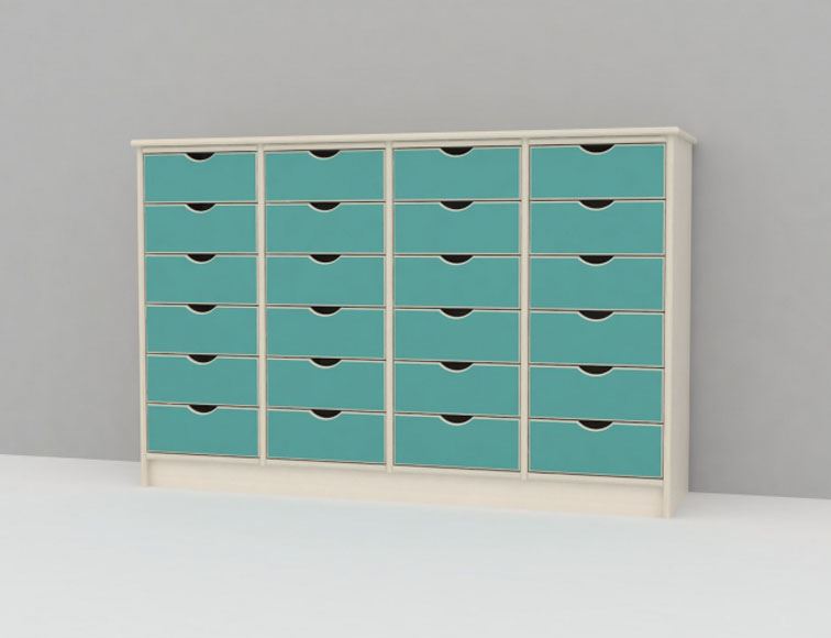 Købmandsdisk med 24 skuffer (store). Skufferne er monteret med glideskinne og har stopfunktion, og der kan vælges imellem skuffer med U-åbning eller brev-åbning. Brug disken som fritstående reol eller som rumdeler. Reolen er udført i hvidpigmenteret birkekrydsfiner, men ønskes et mere farverigt møbel, kan disken leveres med slidstærkt laminat på toppladen, eller på både top og skuffefronter. Kan købes i rullegardin nedenfor. Vælges dette se da farvekort, og husk at oplyse ønskede farve ved bestilling.