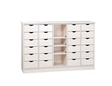 Købmandsdisk med 24 (små) skuffer og 3 justerbare hylder i midten. Skufferne er monteret med glideskinne og har stopfunktion. Der kan vælges imellem skuffer med U-åbning eller brev-åbning. Velegnet som opbevaringsmøbel i institutioner mv. Brug disken som fritstående reol eller som rumdeler. Udført i 18 mm hvidpigmenteret birkekrydsfiner, men ønskes et mere farverigt møbel, kan disken leveres med slidstærkt laminat på toppladen, eller på både top og skuffefronter, hvis man ønsker en mere farverig disk. Kan købes i rullegardin nedenfor. Vælges dette se da farvekort, og husk at oplyse ønskede farve ved bestilling.