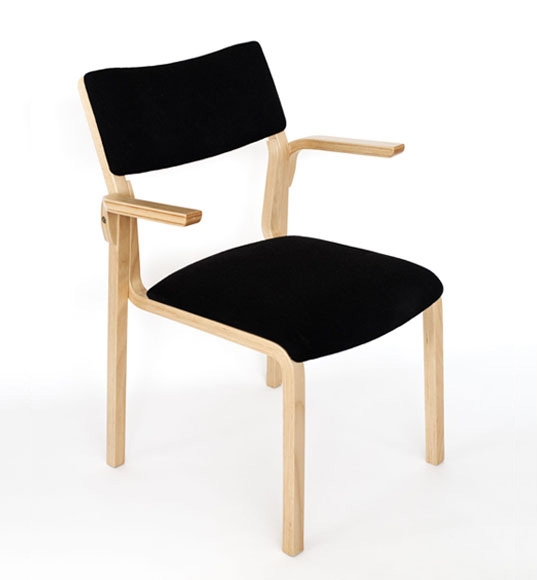 Elegant stabelbar konferencestol med armlæn og polstret sæde og ryg (brandhæmmende skum). Stolen er udført i formspændt bøgefinér (lakeret). En alsidig stol med god siddekomfort, som passer ind de fleste steder. God som konferencestol, stol i mødelokaler, undervisningslokaler mv. Stolen kan stables og kan i øvrigt hænge på bordkanten i armlænene, hvilket bl.a. letter rengøringen og lokalet til at se mere ryddeligt ud, når stolene ikke er i brug.