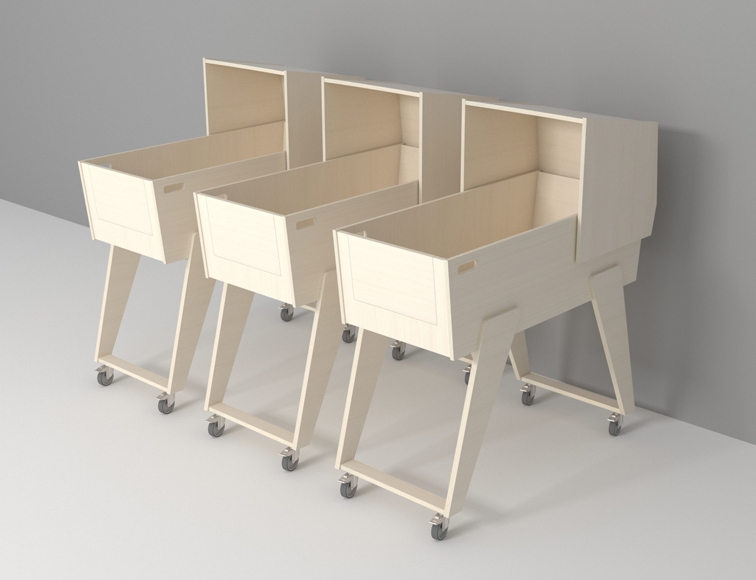 Krybbe i 15mm hvidpigmenteret birkekrydsfiner. Krybben har låsbare hjul, så den nemt kan flyttes efter behov. Derudover er krybben udstyret med en kaleche, som kan trækkes tilbage ca. 400mm, så man nemt kan komme til barnet. I enden af krybben er der lem med åbning så barnet selv kan kravle op og ned. Perfekt til soverummet i vuggestuen eller børnehaven, når der skal hviles midt på dagen.