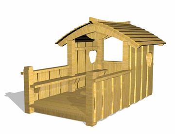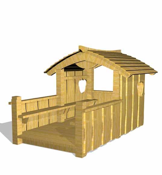 Bjørnebo legehus med gulv og altan. Legehuset har indbyggede bænke langs siderne, som er ført helt ud på altanen, så der er godt med  siddepladser i legehuset både ude og "inde". Indvendig er der derudover også indrettet med et lille bord i midten. Legehuset er udført i Lærk og Douglas træBEMÆRK at legehuset som standard leveres til placering på fliser. RING hvis I ønsker at få monteret stolpesko som tilkøb. Legehuset er TÜV-certificeret.