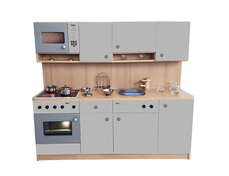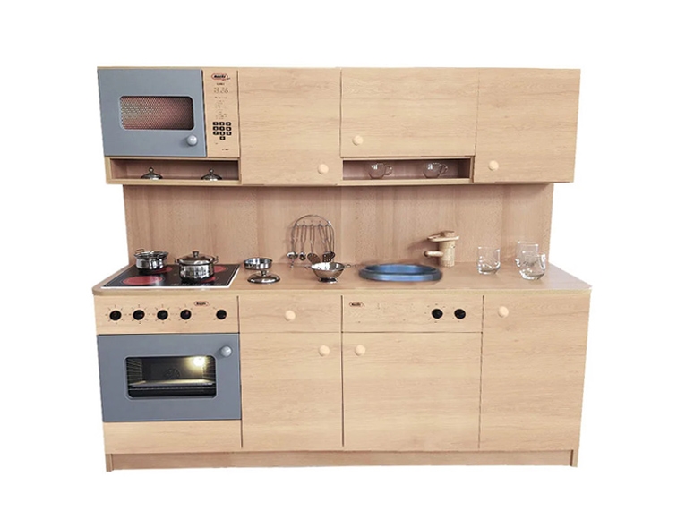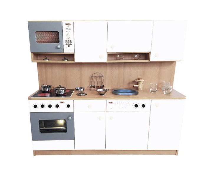 Stort og flot legekøkken med gode detaljer velegnet til institutionsbrug. Køkkenet kommer med ovn, komfur, opvaskemaskine, mikroovn med drejekapper samt rund vask i plast og drejelig vandhane i træ. Skabene har flytbare hylder og låger udstyret med sikkerhedshængsler og dæmpet lukning. Et lækkert legekøkken i top kvalitet som børnene vil elske, som vil danne det perfekte grundlag for rollelege i institutionen. Køkkenet opfylder de nødvendige standarder for møbler til brug i offentlige rum, og er dermed velegnet til vuggestuer, børnehaver mv.