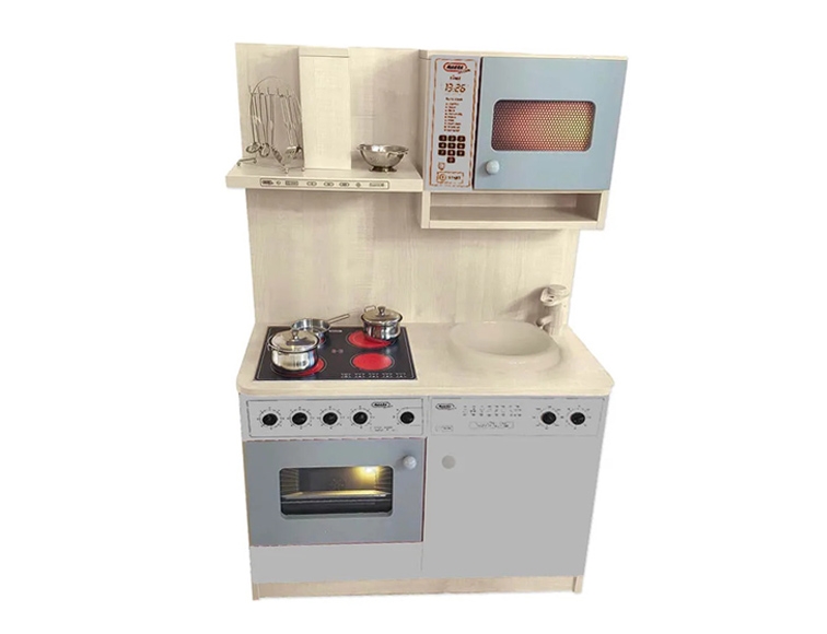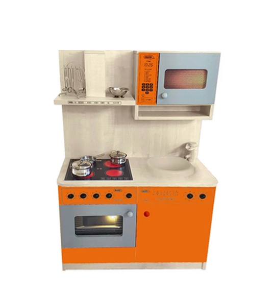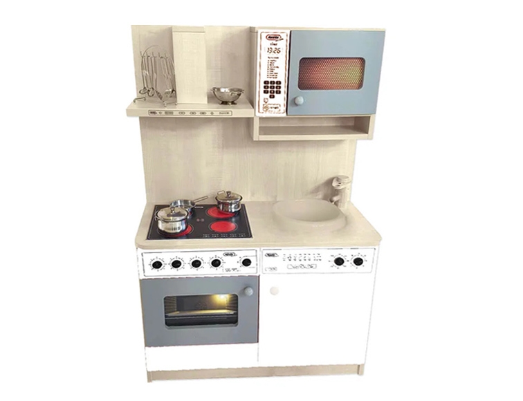 Lille legekøkken i top kvalitet velegnet til brug i institutioner. Køkkenet er udstyret med ovn, komfur og mikroovn med betjeningsknapper. Derudover har køkkenet en plast vask og drejelig vandhane i træ. Skabene har flytbare hylder og låger udstyret med sikkerhedshængsler og dæmpet lukning. Et lækkert legekøkken perfekte til rollelege i institutionen såvel i det private hjem. Opfylder de nødvendige standarder for møbler til brug i det offentlige rum.