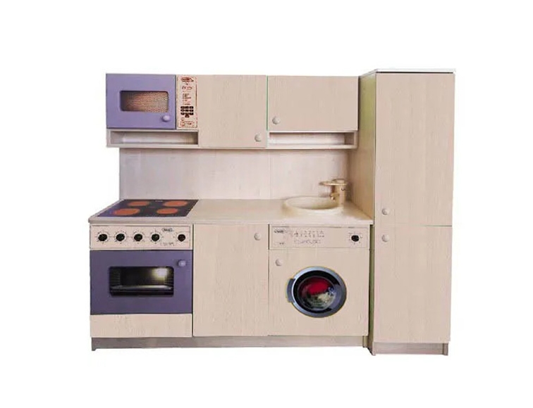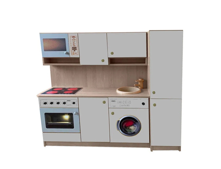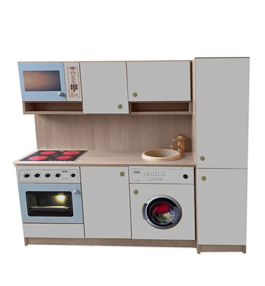 Stort og flot legekøkken / børnekøkken velegnet til brug i institutioner. Køkkenet er udstyret med ovn, komfur, opvaskemaskine/vaskemaskine, mikroovn og køleskab. Derudover har køkkenet en rund vask og drejelig vandhane. Skabene kommer med flytbare hylder og låger udstyret med sikkerhedshængsler og dæmpet lukning. Et kvalitet legekøkken med lækre detaljer som børnene vil elske. Perfekt til rollelege i institutionen. Køkkenet opfylder de nødvendige standarder for møbler til brug i offentlige rum.