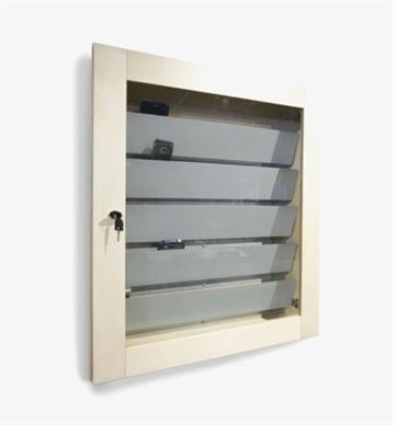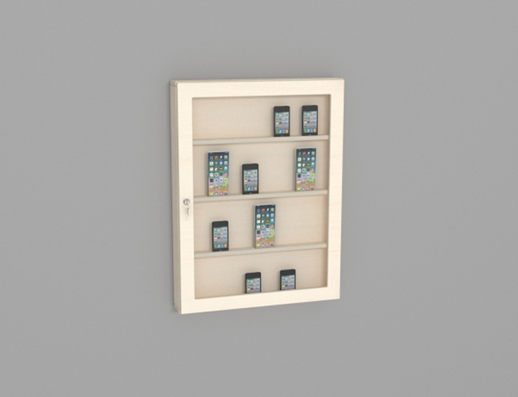 Flot og enkelt telefonskab / mobilhotel til opbevaring af mobiltelefoner. Ideel til brug i skoler og andre institutioner, hvor der kan være behov for et skab til at opbevare og låse børn og voksnes mobiletelefoner inde i, mens der fx undervises. Så er der ro i timerne og større koncentration. Skabet er udført i 15 mm hvidpigmenteret birkekrydsfiner og er indrettet med 4 hylder som har udfræset rille, så mobilerne kan stå op. Der er plads til ca. 25 mobiltelefoner i skabet som kan låses. Leveres med Hekna lås med 2 nøgler.