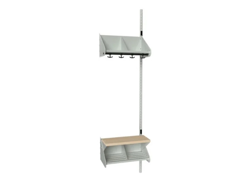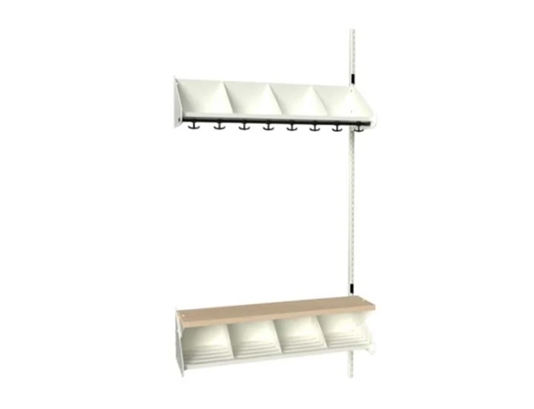 Påbygningssektion med bænk (birk højtrykslaminat) til udbygning af BST børnegarderobe i pulverlakeret stål, startersektion kombi G. Denne påbygningssektionen kommer med én vægskinne i stedet for to som startersektionerne (se billeder). Med denne kan I nemt bygge videre på garderoben ud fra startersektionen, og tilføje garderobepladser efter behov. BST børnegarderoben kommer med afrundede kanter, perfekt til indretningen af garderoben i skoler og institutioner. Et robust og fleksibelt garderobesystem med mange muligheder. Påbygningssektionerne, er ligesom startersektionerne, som standard til vægmontering, og fås i 5 forskellige bredder med henholdsvis 2-4 garderobe-pladser. Se mere nedenfor.
