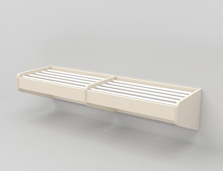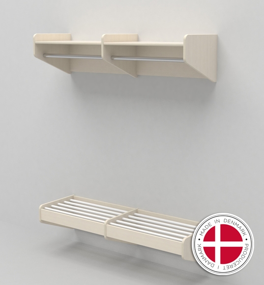 Sammensæt jeres egen personalegarderobe bestående af skohylde med rist samt hattehylde med bøjlestang til montering på væg. Sko -og hattehylden er udført i 15mm hvidpigmenteret birkekrydsfiner med rundede forkanter. Skorist og bøjlestang består af 19mm alu rør. Ved at kombinere de to dele, får I et lækkert garderobemiljø tilpasset jeres sted. Lignende garderobe fås også med små aflåselige garderobeskabe med bøjlestang, som ses på inspirations billedet. Denne opstilling kan købes her - Personalegarderobe, sektionsvis. Se vejledende priser mm for sko -og hattehylde, og vælg ønskede i rullegardin nedenfor. HUSK angiv ønskede længde ved bestilling, samt evt. placering af skillerum. Vejledende tegning har 2 sektioner á ca. 2 m.
