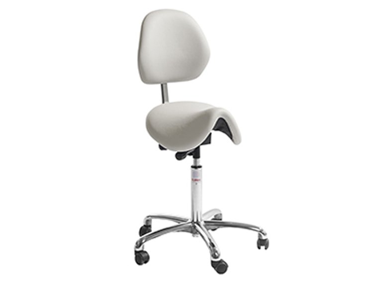 Pinto saddelstol med ryglæn og ekstra blødt sæde. Sadlen er polstret med koldskum og betrukket med PVC-fri kunstlæder, Oeko-Tex Standard 100 mærket. En komfortable og brugervenlig stol, god til brug i plejesektoren, diverse behandlingshjem, klinikker mv. Stolen har en alu base 61 cm i diameter med 5 letløbende hjul (Ø50mm). En god ergonomisk behandlerstol som sikre gode og sunde arbejdsstillinger. Sæde -og ryglænsvinklen kan indstilles hurtigt og nemt mens man sidder på stolen.