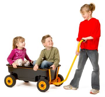 Trækvognen er indrettet med to sæder som er fremstillet af syntetiske materialer og er derfor lette at tørre af efter en travl dag på legepladsen. Sæderne kan tages ud for at lette rengøringen eller skabe plads til flere børn. Legevognen er meget stabil og kan rumme 3-4 børn alt efter alder. Den er ekstremt solid og nærmest umulig at beskadige ved normal brug.