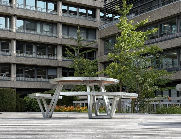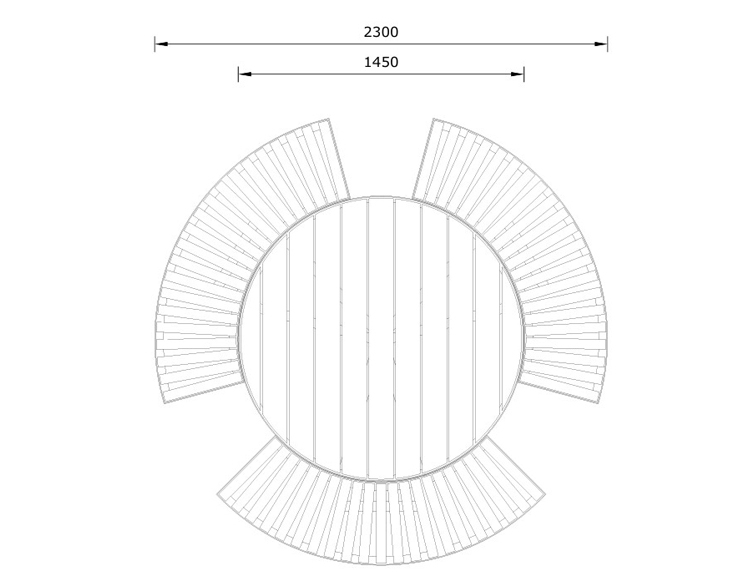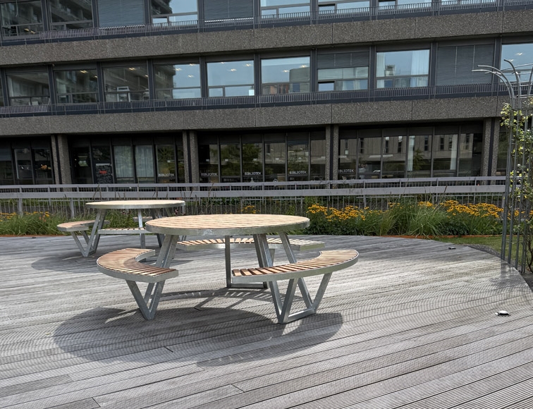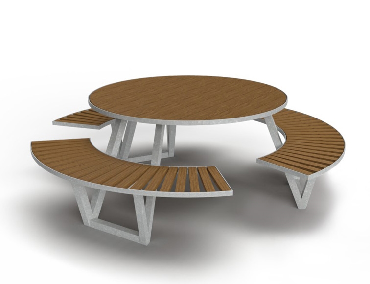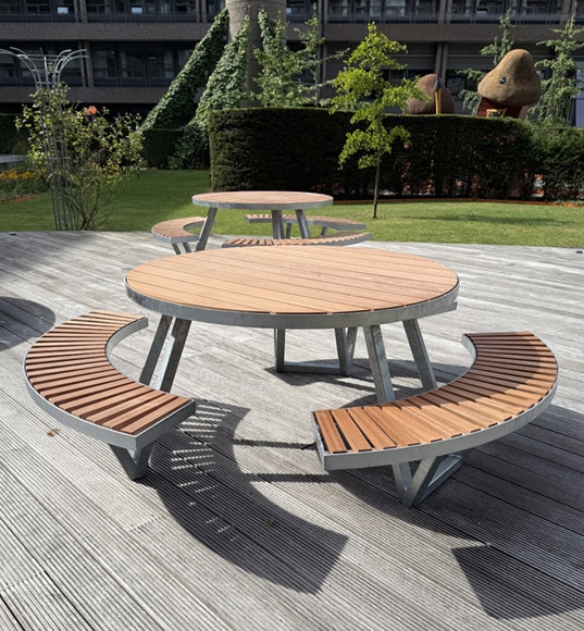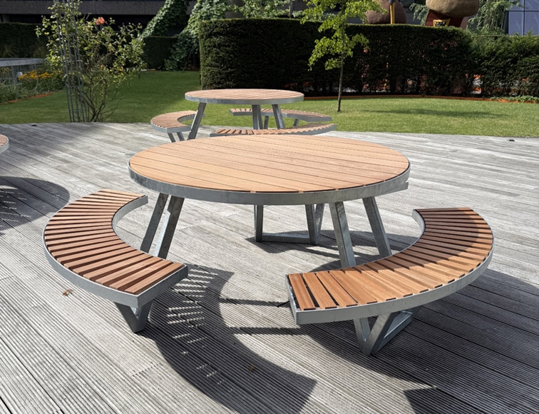 Cirklen er et flot rundt bord/bænkesæt perfekt til ethvert uderum. Dette rundbord med integrerede bænke har stel i varmgalvaniseret stål monteret med mahogni lister som standard. Ved ønske kan stellet pulverlakeres i ønskede RAL farve eller Zink behandles, som giver et lidt glattere resultat end galvaniseringen, som er lidt mere ujævn i overfladen. Derudover kan bord/bænkesættet fås med lister i andre træsorter. RING eller SKRIV for priser ved ønske om andet træ, pulverlakeret eller zinkbehandlet stel.