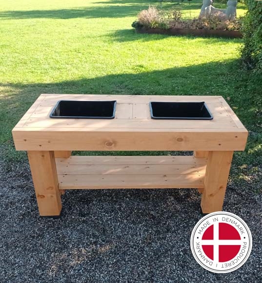 Sand og vand legebord udført i oliebehandlet / brunlaseret svensk nordlandsfyr. Legebordet har to plast kar i bordpladen, perfekt til legepladsen sandområde. Kombiner evt. legebordet med legekøkkenet fra serien, og få et godt stort mudderkøkken til legepladsen, ideel til rollelege og temalege i institutionen. Legebordet kan stå ude ude året rundt. Leveres samlet.