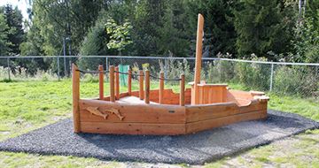 Sørøverskib i træ til legepladsen. Skibet har hævet stævn, styrehus og mast. Sjovt legeredskab til legeområdet ved fx børnehaven. Giver børnene mulighed for at bruge fantasien og skabe deres helt egen legeunivers. Skibsrammen og stolper ved gelænder er lavet i robinie og dørk/gulv i sibirisk lærketræ. Sidebeklædning er i lærke – eller robiniekalmer, alt fint afpudset og olieret. Legeskibet er pyntet med delfiner på stævnen og er ideel til de små børn på legepladsen, da skibet har lav faldhøjde og ikke har krav om faldunderlag. Står frit på jorden.