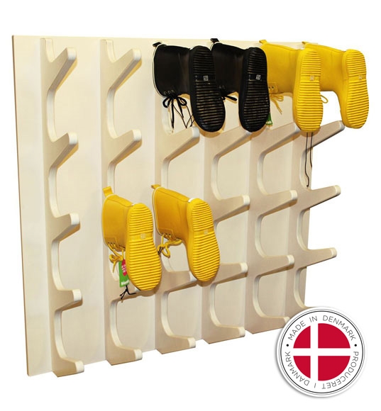 Støvlevæg i 18mm hvidpigmenteret birkekrydsfiner er en let og elegant måde at opbevare støvler og andet fodtøj på. Støvlevæggen kan leveres til hhv. 5, 10 eller 15 par støvler. Vælg model nedenfor.