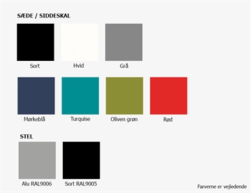 Farver: Vælg imellem stel i farve Alugrå eller Sort, og siddeskal i farve Grå, Sort, Rød, Hvid, Blå, Turkis og Oliven. Vælg ønskede farvekombination i rullegardin nedenfor.