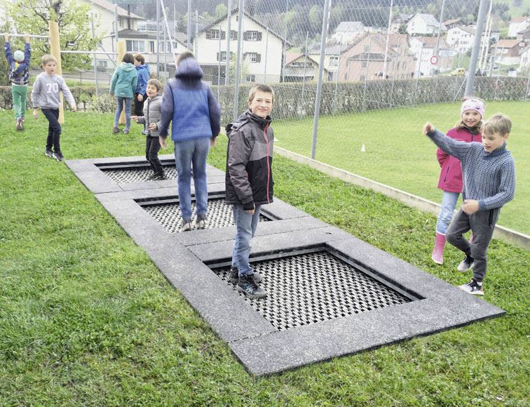 Udenoms-arealet til en trampolin kan være græs, sand, gummifliser eller helstøbt gummi. Se vores udvalg af faldunderlag her.