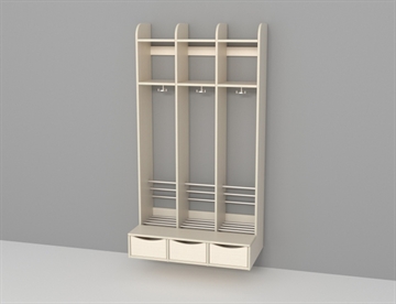 Troldegarderobe med bænk og skuffe velegnet til børnehaver og institutioner. Børnegarderoben er udført i 15 mm hvidpigmenteret birkekrydsfiner, og er som standard beregnet til vægmontering. Garderoben indeholder som standard pr. sektion / rum fodtøjsrist, sutskoholder, drejekrog m. 3 kroge, rum i toppen, skuffe og bænk.