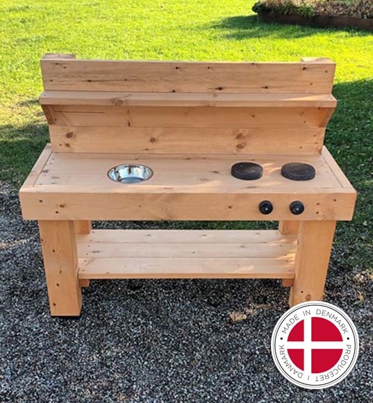 Fint udendørs legekøkken / mudderkøkken udført i oliebehandlet / brunlaseret svensk nordlandsfyr. Kogeplader og knapper er i sort genbrugsplast. Sjovt legekøkken til ethvert legeområde, så kan der skal laves sandkager og muddermadder i lange baner. God til rollelege og temalege på legepladsen i institutionen. Køb evt. tilhørende Sand og vandbord, som ses på nogle af billederne, så er der mere plads at lege på. Legekøkkenet kan stå ude ude året rundt. Leveres samlet.