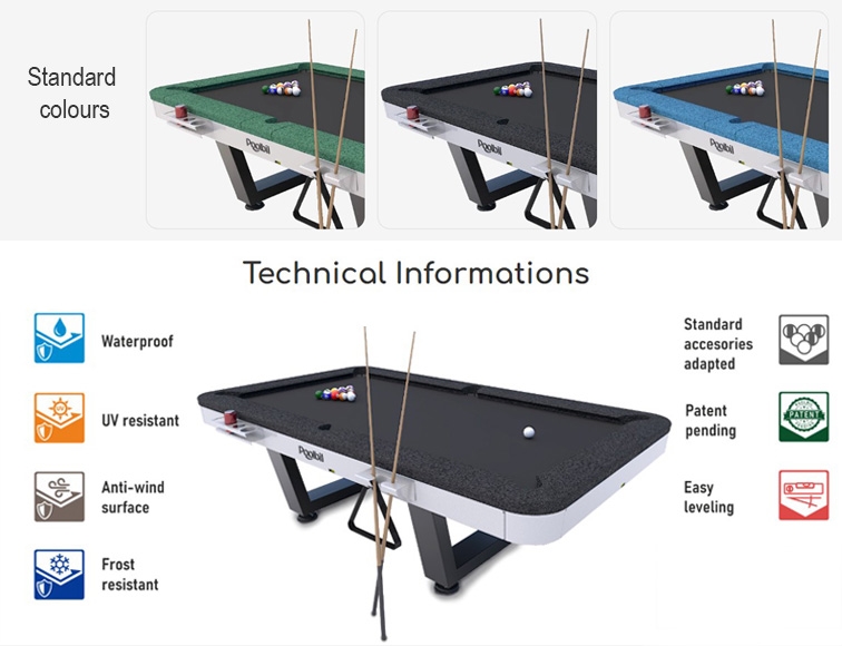 Poolbill er et innovativt og patenteret udendørs poolbord. Et aktivitetsbord i høj kvalitet, designet til helårsbrug i offentlige udendørs miljøer. Poolbill kombinerer høj kvalitet med funktionelt design, og gør det muligt at spille billard i det fri – hele året rundt. Poolbordet er lavet med en robust stålkonstruktion og i vejrbestandige materialer, som gør at bordet tåler både regn, frost, UV-stråling og dagligt slid. Det perfekte poolbord til parker, skolegårde, boligområder, hotelterrasser, kontorfællesarealer mm. God løsning til at skabe socialt samvær og aktiv fritid i det offentlige rumStandard EN 11762017-12Brugervenligt design, nem montering. BEMÆRK at køer og bolde ikke medfølger som standard. Kan tilkøbes nedenfor.