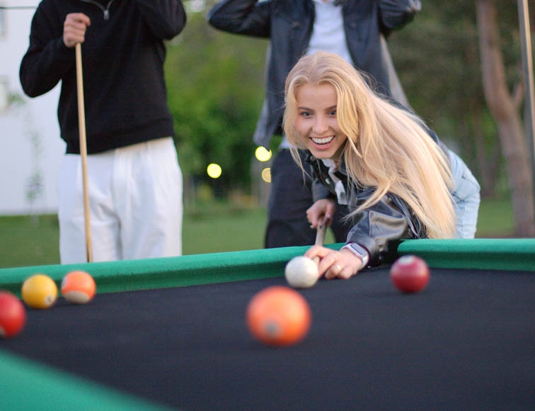 • Indbygget opbevaringsrum til køer og billiardkugler