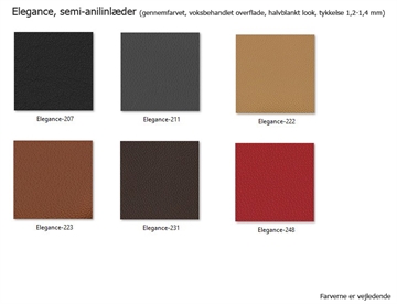 Farver: Se vejledende farvekort for Cura møbelstof (100% genbrugspolyester) og Elegance Semianilin Læder (okse) under billeder, og vælg ønskede variant nedenfor. HUSK at oplyse ønskede farve ved bestilling under notat.