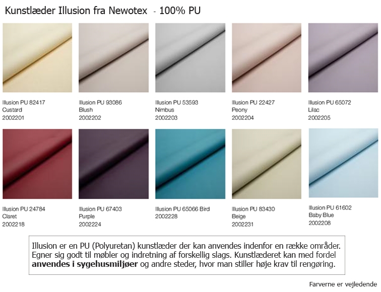 * BEMÆRK at Illusion kunstlæder fra Newotex ofte bruges på møbler til sygehusmiljøer og andre steder, hvor der stilles høje krav til rengøring, og anbefales derfor til sådanne miljøer. Uniserien tilbydes derudover i et stort udvalg af forskellige tekstiler og læder typer. RING eller SKRIV hvis I ønsker sofaen i andre farver og materiale end beskrevet her.