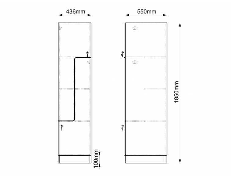 Mål: Højde: 1850 mm. Bredde: 436 mm. Dybde: 550 mm.